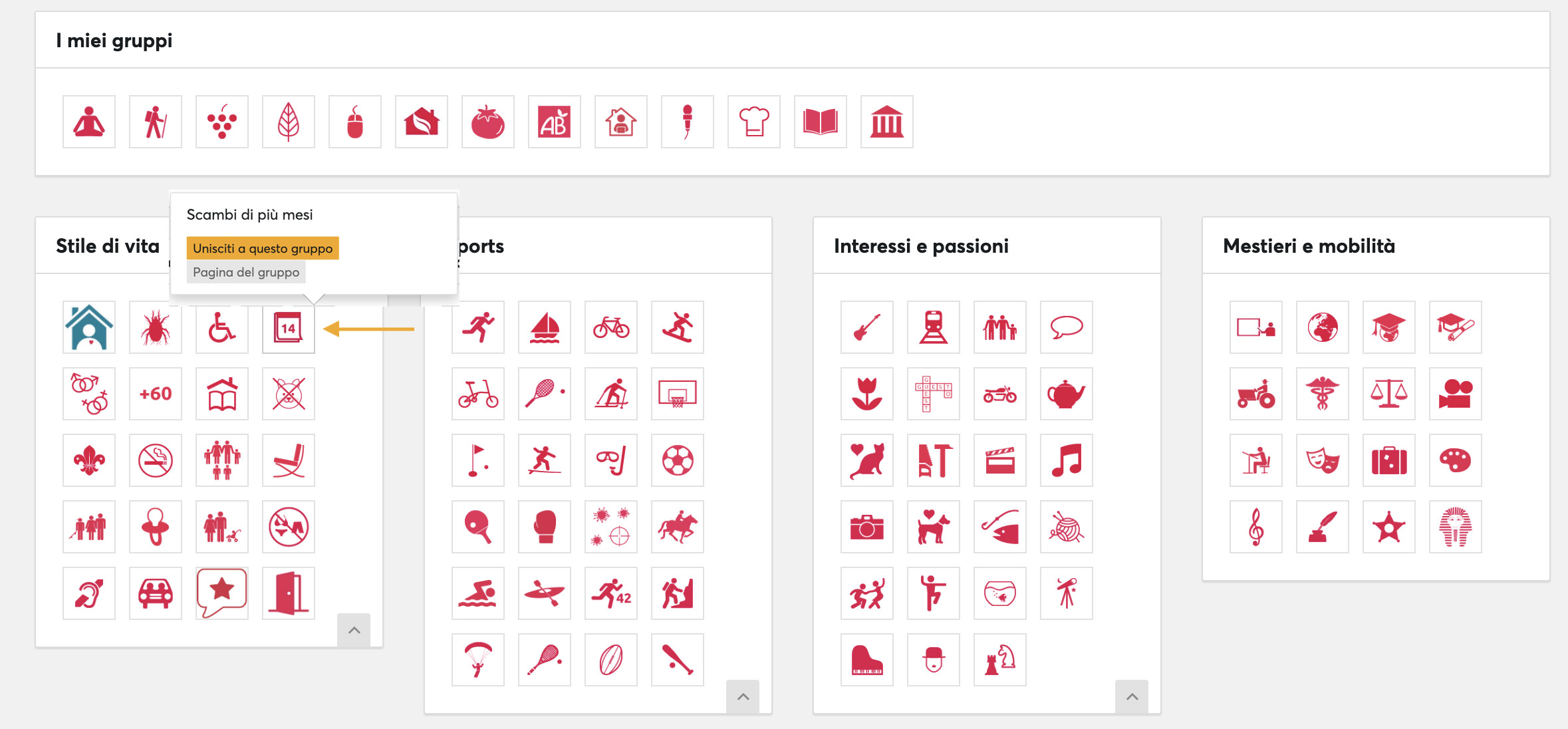 - Unisciti al gruppo ““Scambi di più mesi”: troverai membri interessati come te a scambi di lunga durata. Non esitare a usare il filtro “gruppi” quando fai una ricerca. Così, entrando nel gruppo, apparirai anche nelle ricerche degli altri membri che cercano uno scambio nel tuo paese. Si trova nella sezione Gruppi > Stile di vita, e ha l’icona di un calendario.