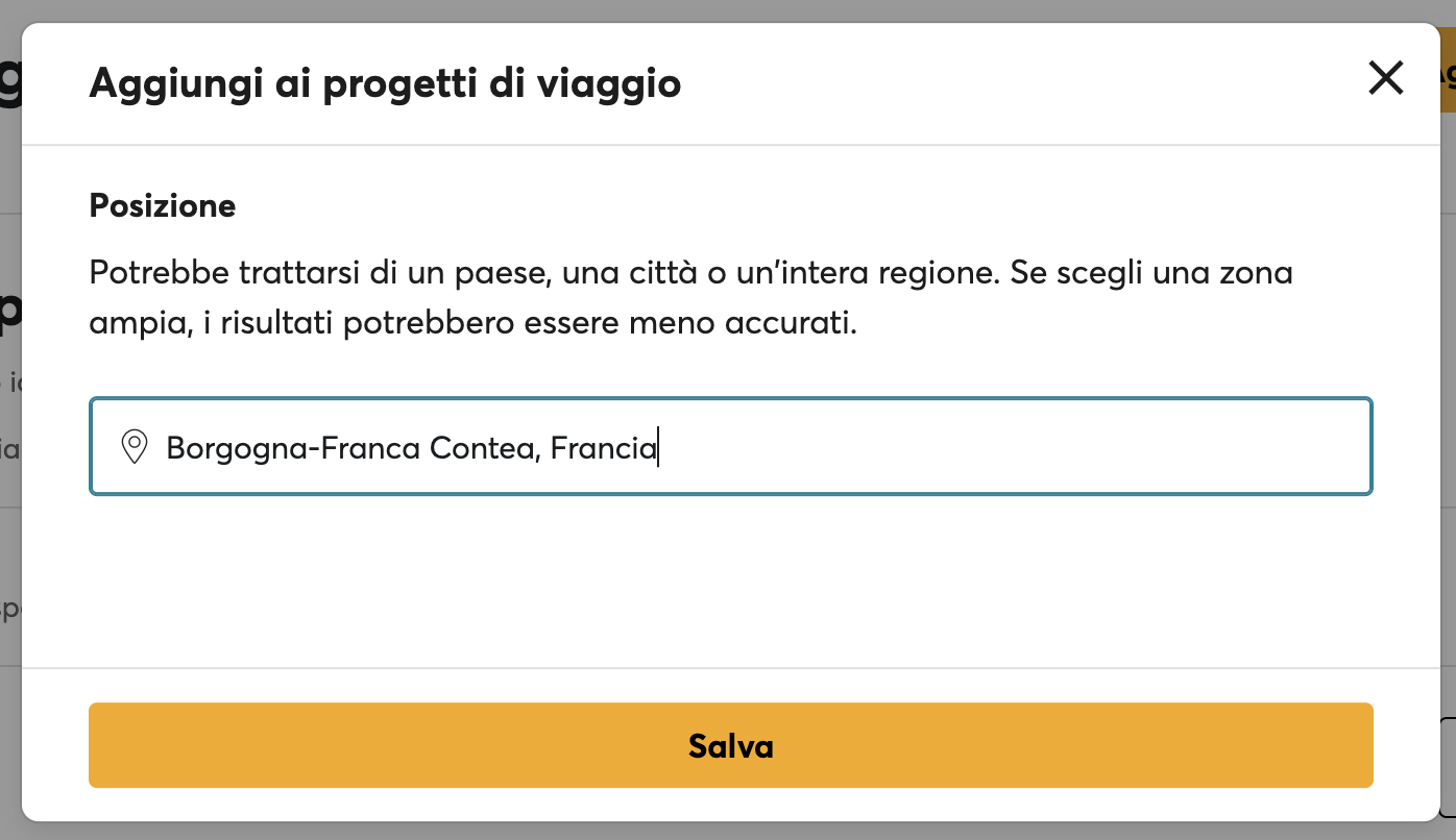 Per salvare la tua ricerca, inclusi i criteri di ricerca (date e numero di viaggiatori), e quindi includerla tra i tuoi progetti di viaggio, clicca su “Salva questo progetto di viaggio”.